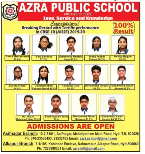 Azra Public School is a school in Asif Nagar, Hyderabad which is Affiliated to CBSE.