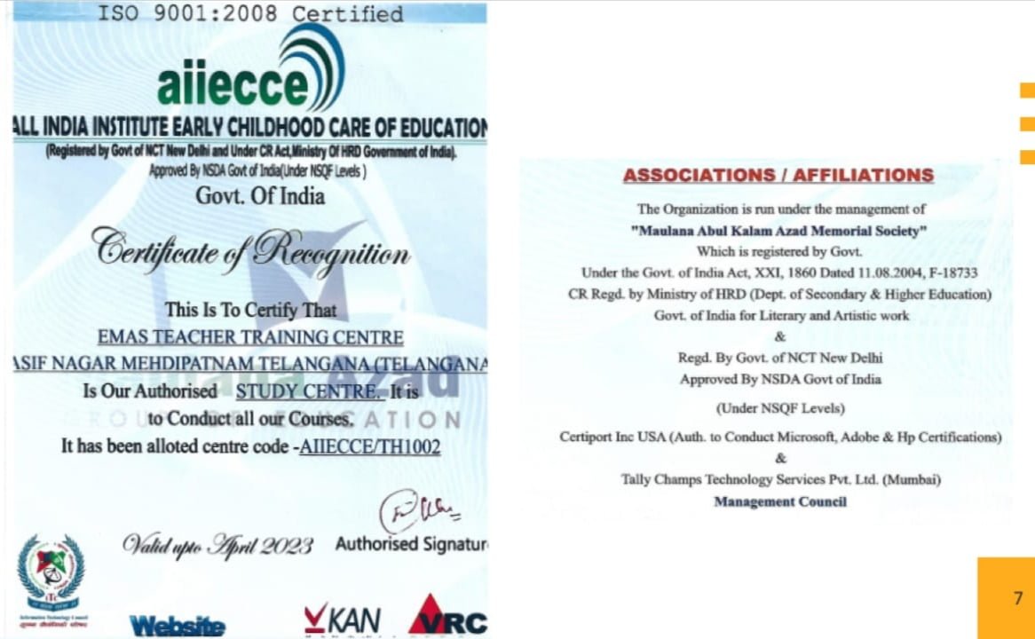 EMAS Teacher Training Centre is Affiliated to All India Institute of Early Childhood Care & Education, have been run under The Best Education Society, Regd. by NCT Govt. of India New Delhi .Regd.
