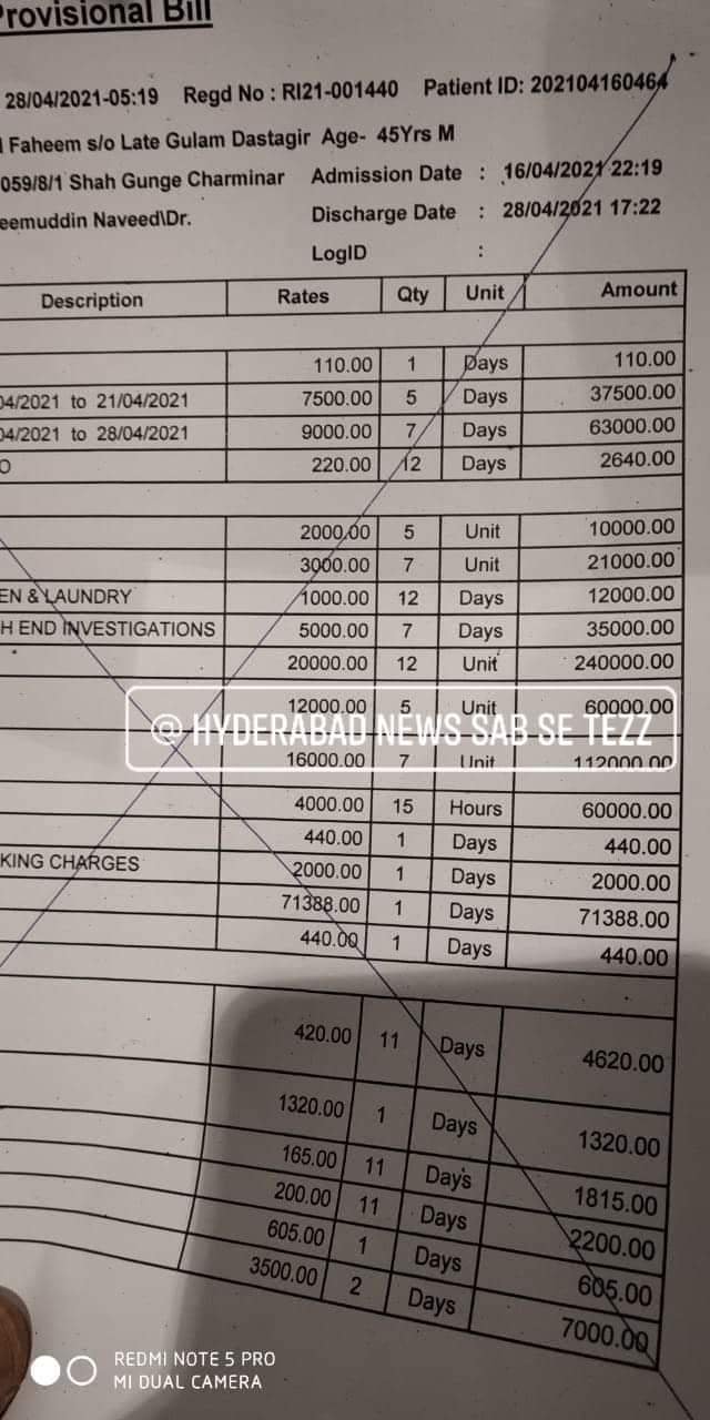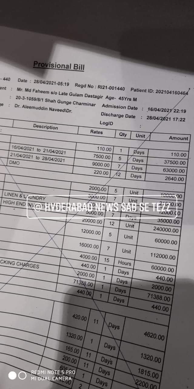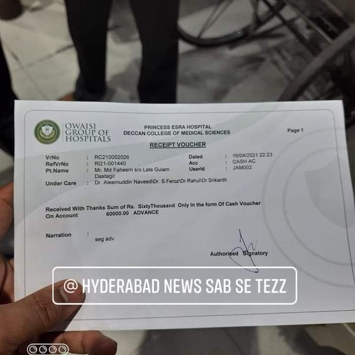 Mohammed Faheem r/o H No: 19-4-280/2/1 Nawab Saheb Kunta a Covid positive patient who was admitted in Princess Esra Hospital managed by AIMIM party died just now, the patient relatives paid Rs/ 1.60 lakhs and Hospital authorities are demanding 6.50 lakhs more to hand over the dead body.