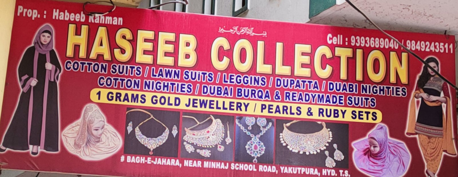 Haseeb Collection is collection of cotton suits,lawn suits, leggins etc. It also sells 1grams gold jewellery, pearls and ruby set
