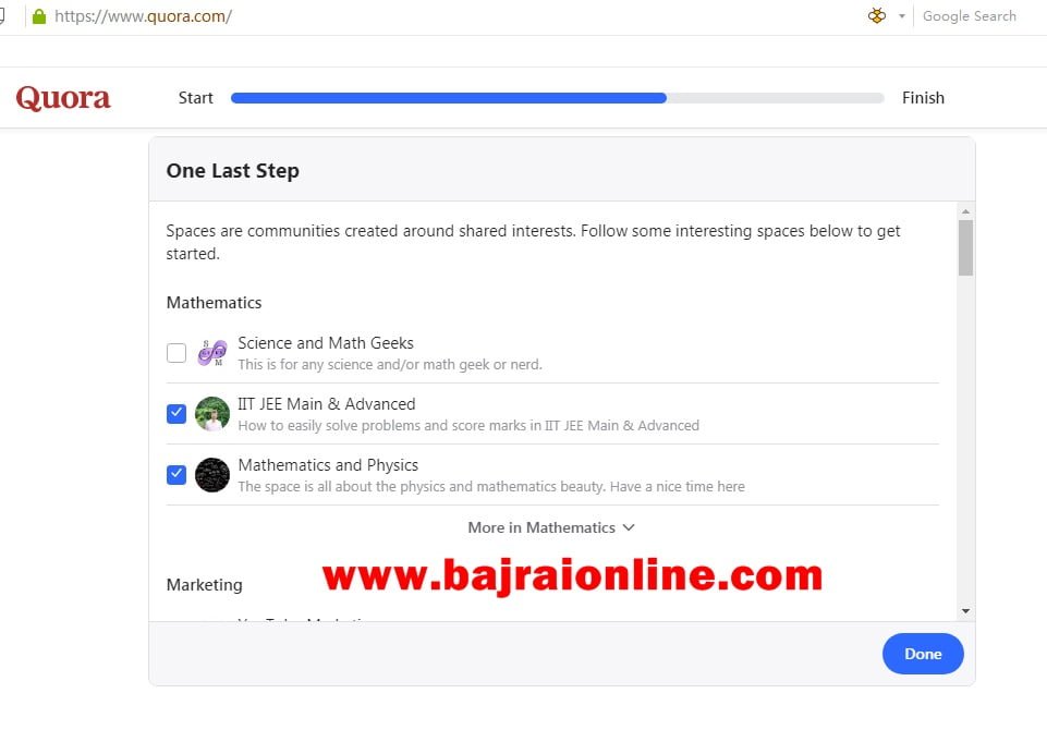 Then last Step to complete your profile is , from your interested areas you have to select 5 spaces, In Quora Spaces are nothing but the communities created around shared interests.
