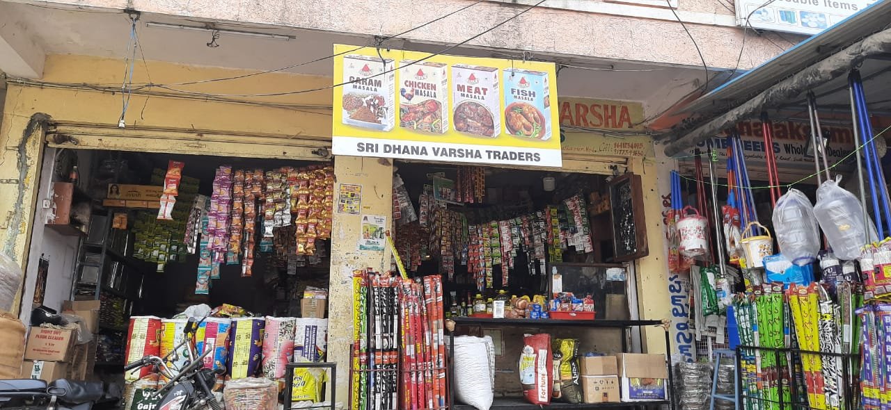 Sri Dhana Varsha Traders is a grocery shop in Gudimalkapur where all home essentials are available like sweeps, tooth paste, tooth powders, bread, bun, chips, locks etc are available.