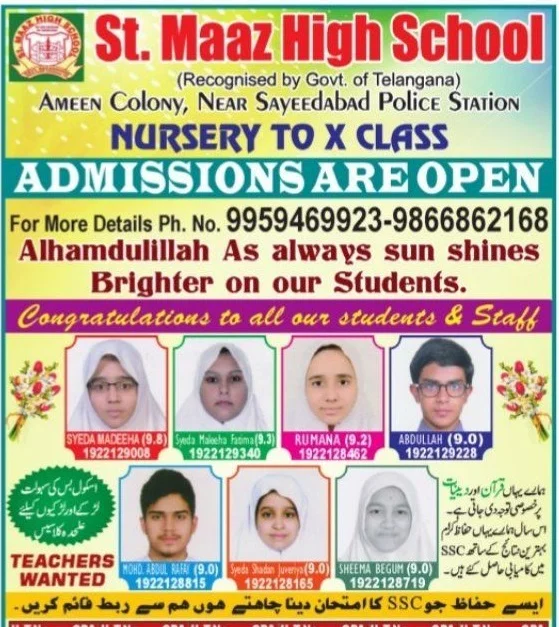 St. Maaz High School is a quite famous in Hyderabad especially in Old City. St. Maaz High School is also popular among Huffaz (Hafiz) students. Many Huffaz got good marks in SSC after writing exams.